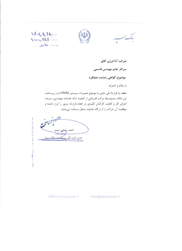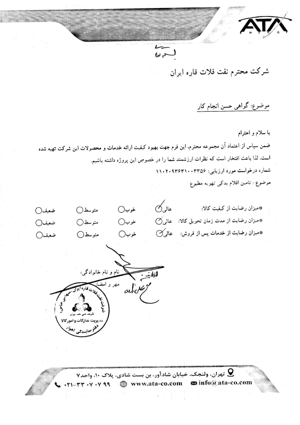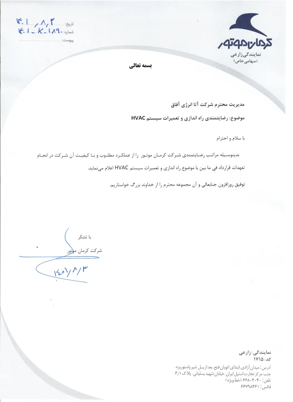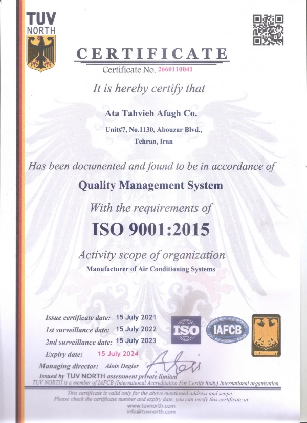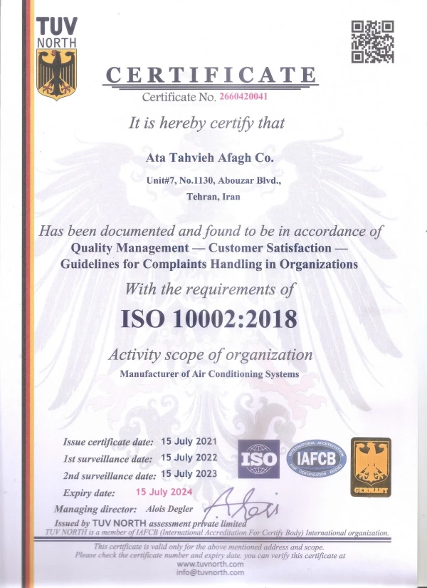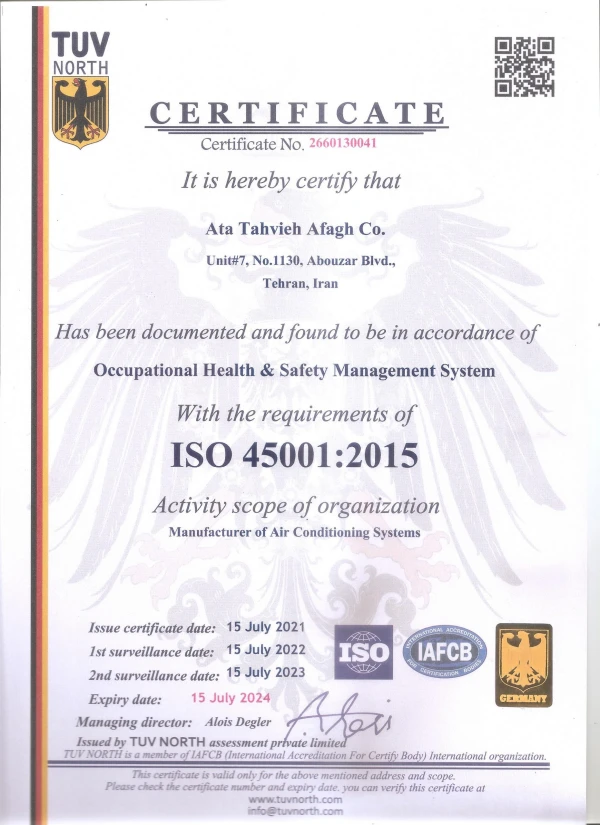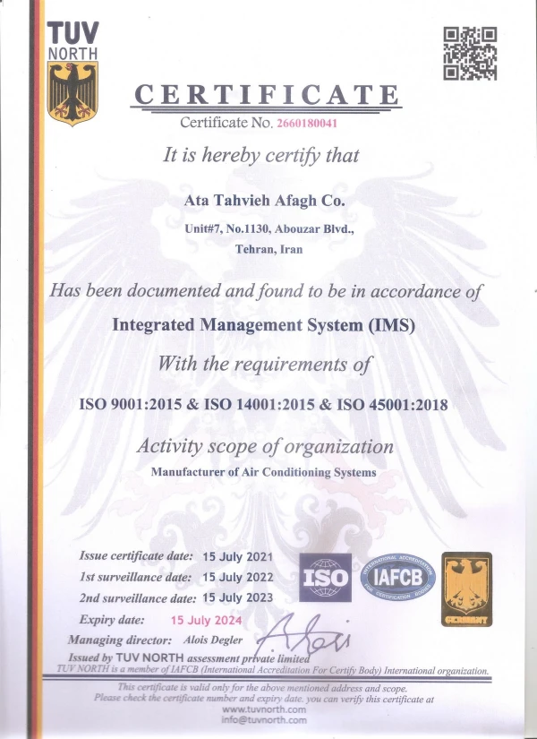 شرکت آتا انرژی بهعنوان یکی از مجموعههای معتبر فعال در حوزه طراحی، تولید و اجرای سیستمهای تهویه مطبوع صنعتی، تمامی فرایندهای خود را مطابق با استانداردهای ملی، بینالمللی و الزامات قانونی اجرا میکند. اخذ گواهینامهها و صلاحیتهای تخصصی در حوزههای مدیریتی، فنی، ایمنی و پیمانکاری، پشتوانهای برای کیفیت محصولات و توان اجرایی این شرکت در پروژههای بزرگ صنعتی، نفت و گاز، نیروگاهی و ساختمانی است.