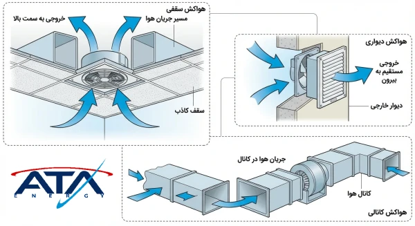 انتخاب نوع فن تخلیه مناسب، تا حد زیادی به محل نصب و نوع فضای مورد تهویه هم بستگی دارد. در این بخش رایجترین انواع فنها بر اساس محل نصب معرفی شدهاند.