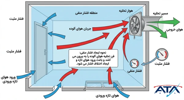 اگزاست فن تنها برای خروج هوا طراحی شده است و برای ورود هوای تازه باید مسیر ورودی جداگانه در نظر گرفته شود. در اغلب طراحیهای مهندسی، این موضوع با نصب دریچه یا فن تامین هوا (Supply Fan) حل میشود.