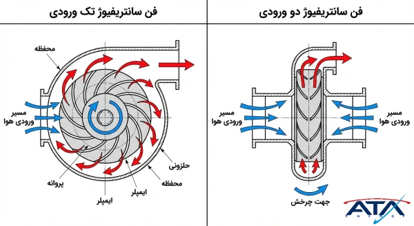 تصویر مقایسهای شماتیک که تفاوت شکل پرهها و مسیر جریان هوا را در فنهای آکسیال (موازی محور) و سانتریفیوژ (گریز از مرکز) نشان دهد.