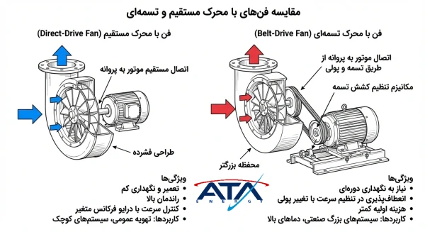 فنها میتوانند از سیستمهای فن کوپل مستقیم Direct Drive برای دبی کم و فشار پایین یا از فن تسمهای Belt Drive برای فشار و دبی بالا بهرهمند شوند. انتخاب سیستم مناسب بر اساس شرایط کاری و ظرفیت فن انجام میشود. همچنین، کنترل سرعت با VFD امکان تطبیق دبی هوا با نیاز واقعی فضا را فراهم میکند و مصرف انرژی را کاهش میدهد.