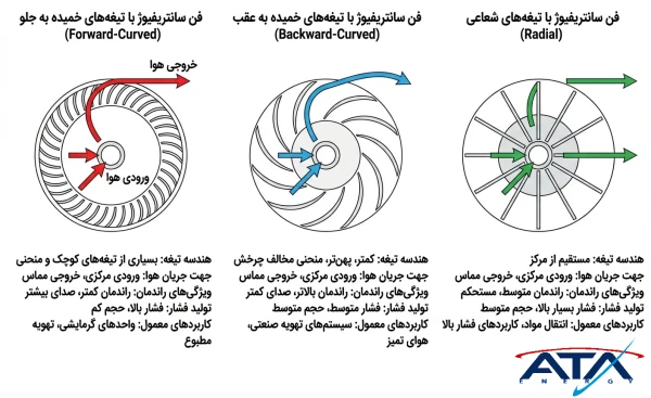 انواع اصلی فنهای سانتریفیوژ بر اساس طراحی پره و عملکرد به ۳ دسته فوروارد، بکوارد و رادیال تقسیم میشوند. هر کدام ویژگیها و کاربردهای خاص خود را دارند که انتخاب صحیح به نیاز پروژه بستگی دارد.