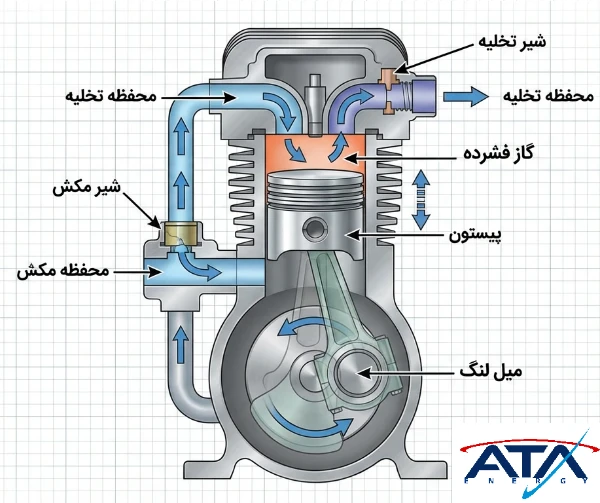 کمپرسورهای پیستونی از نوع جابجایی مثبت (Positive Displacement) هستند و بر اساس حرکت رفتوبرگشتی پیستون کار میکنند.