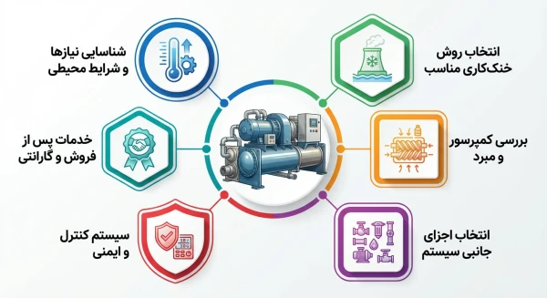خرید چیلر اسکرو مناسب مانند خرید انواع چیلر، نیازمند دقت و توجه به چند عامل کلیدی است تا عملکرد سیستم بهینه باشد و طول عمر تجهیزات افزایش یابد. در ادامه مهمترین نکات برای انتخاب درست را نوشتهایم.