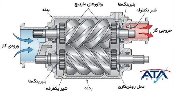 در واقع کمپرسور اسکرو از ۲ روتور حلزونی (روتور نر و روتور ماده) تشکیل شده است و میتواند جریان تقریبا ثابتی ارائه دهد.
