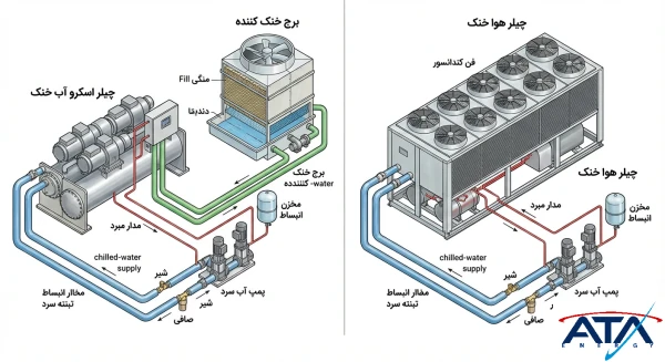 اواپراتور، برج خنککننده و پمپ آب باید با ظرفیت چیلر همخوانی داشته باشند تا سیستم به صورت یکپارچه و بدون مشکل کار کند.