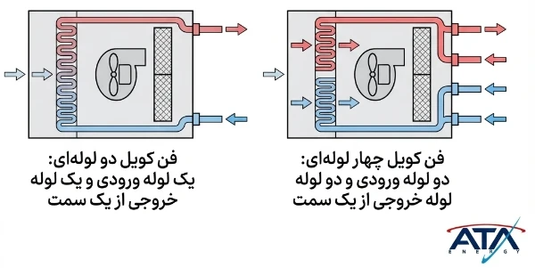 کویلها میتوانند به صورت ۲ لولهای (تکفصل) یا ۴ لولهای (دوفصل) باشند. در فن کویلهای ۴ لوله، امکان تنظیم همزمان سرمایش و گرمایش وجود دارد و در نوع ۲ لوله، هر بار نیاز به تعویض یا تغییر مسیر آب است.