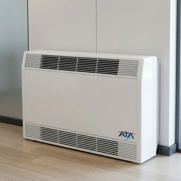 فن کویل زمینی (Floor Fan Coil Units) که به فن کویل عمودی نیز شناخته میشود، به صورت عمودی روی زمین نصب میشود و عملکردی مشابه رادیاتور دارد. این دستگاه، هوای محیط را از طریق مکش وارد محفظه داخلی خود کرده، سپس با عبور از روی کویلهای حاوی آب گرم یا سرد، دمای هوا را تغییر داده و آن را به فضای اتاق بازمیگرداند.
