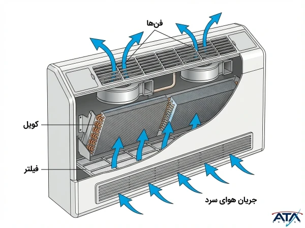 فن کویل زمینی از ۲ بخش اصلی مبدل حرارتی (کویل) و فن (دمنده) تشکیل شده است. این محصول با دریافت آب سرد یا گرم از سیستم مرکزی، آن را از طریق کویل حرارتی به جریان درمیآورد. فن دستگاه، هوای محیط را از روی کویل عبور داده و بسته به نیاز، هوای خنک یا گرم را با راندمان بالا در فضا پخش میکند.