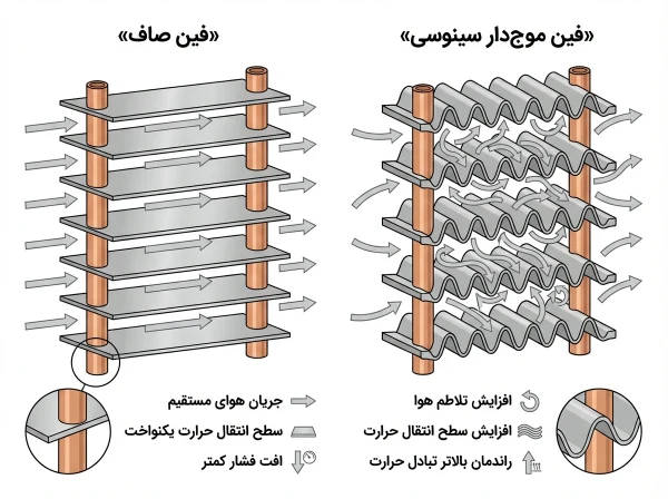 این قطعه معمولاً از لولههای مسی یا آلومینیومی و فینهای حرارتی ساخته میشود تا سطح تماس با هوا یا آب افزایش یابد و گرما سریعتر دفع شود.