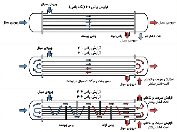 لازم به ذکر است نحوه آرایش پاسها تأثیر مستقیمی بر سرعت سیال، تلاطم، راندمان تبادل حرارت و افت فشار دارد.