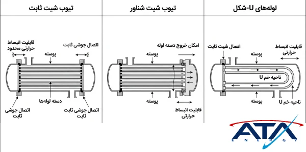 انواع مبدل شل اند تیوب بر اساس ساختار انتهایی و نحوه اتصال دسته لوله به پوسته، به ۳ دسته اصلی مبدل با تیوب شیت ثابت، تیوب شیت شناور و مبدل با لولههای U-شکل طبقهبندی میشود. هر یک از این مدلها مزایا و محدودیتهای خاص خود را دارند که در ادامه بررسی میکنیم.