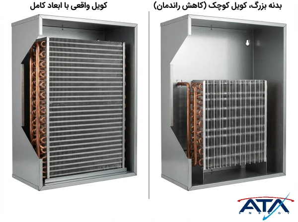 یکی از مواردی که هنگام خرید یونیت هیتر باید به آن توجه کرد، تناسب ابعاد بدنه با اندازه واقعی کویل است. در برخی مدلهای بیکیفیت، بدنه بزرگ ولی کویل کوچک استفاده میشود که باعث کاهش جدی ظرفیت حرارتی و افزایش مصرف انرژی میشود. بررسی ابعاد واقعی کویل، تعداد ردیفها و تراکم فین، معیار مهمی برای اطمینان از راندمان واقعی دستگاه است.