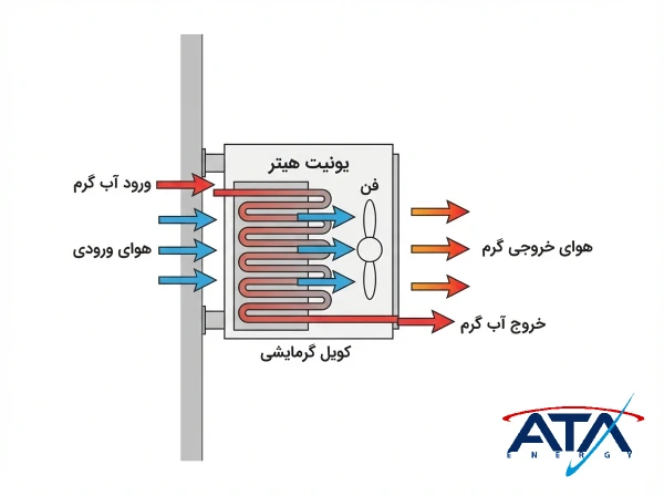 یونیت هیتر آبگرم، یک مبدل حرارتی جریانی است که با عبور هوا از روی کویل آبگرم و دمش آن توسط فن، گرمای یکنواخت و پرفشار را برای سالنهای صنعتی، تجاری و فضاهای بزرگ تأمین میکند. این سیستم با راندمان بالا، مصرف کم و انعطافپذیری در نصب، یکی از مطمئنترین راهکارهای گرمایش محیطی است.